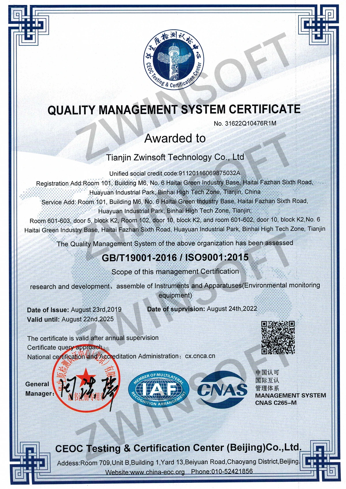 Tianjin Zwinsoft Technology Co., Ltd. is a high-tech company started by a PhD from Nankai University. Founded in 2013, it is primarily focused on online monitoring of various environmental parameters and online services. It is a prominent product supplier in the environmental monitoring business, combining R&D, manufacturing, sales, and services.